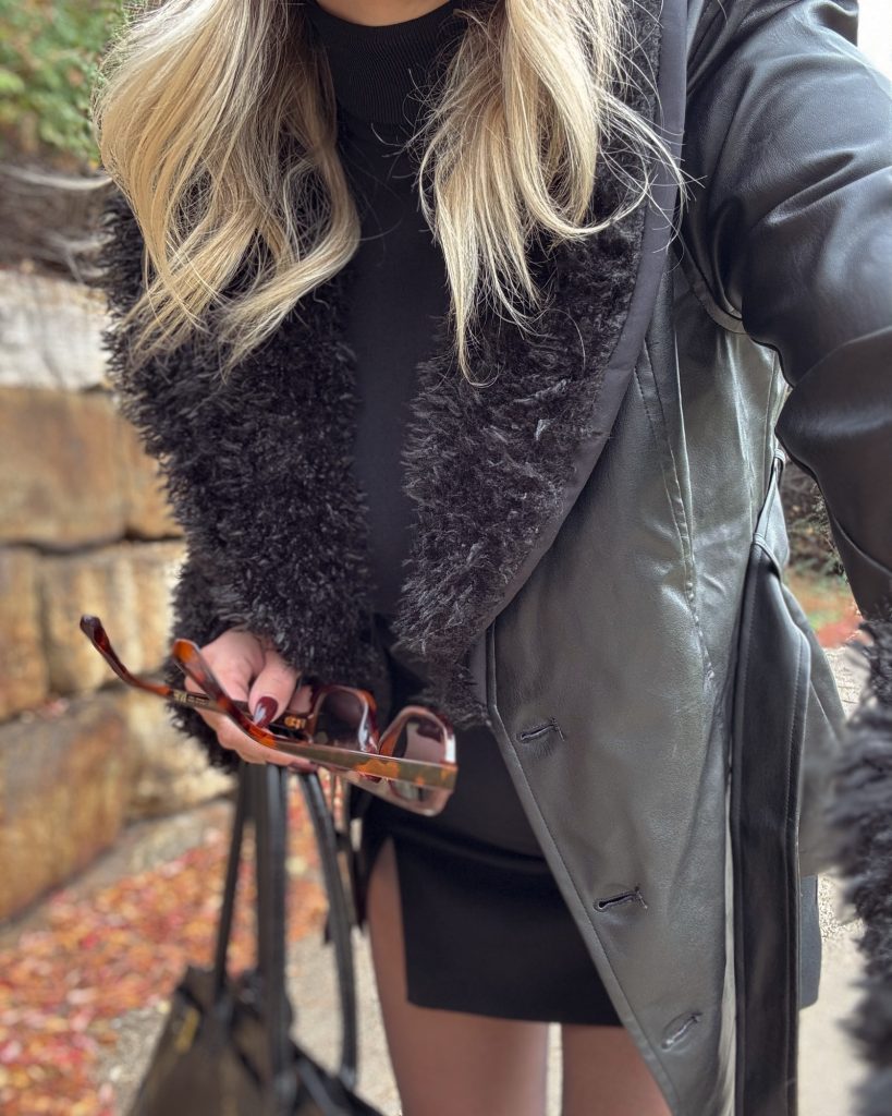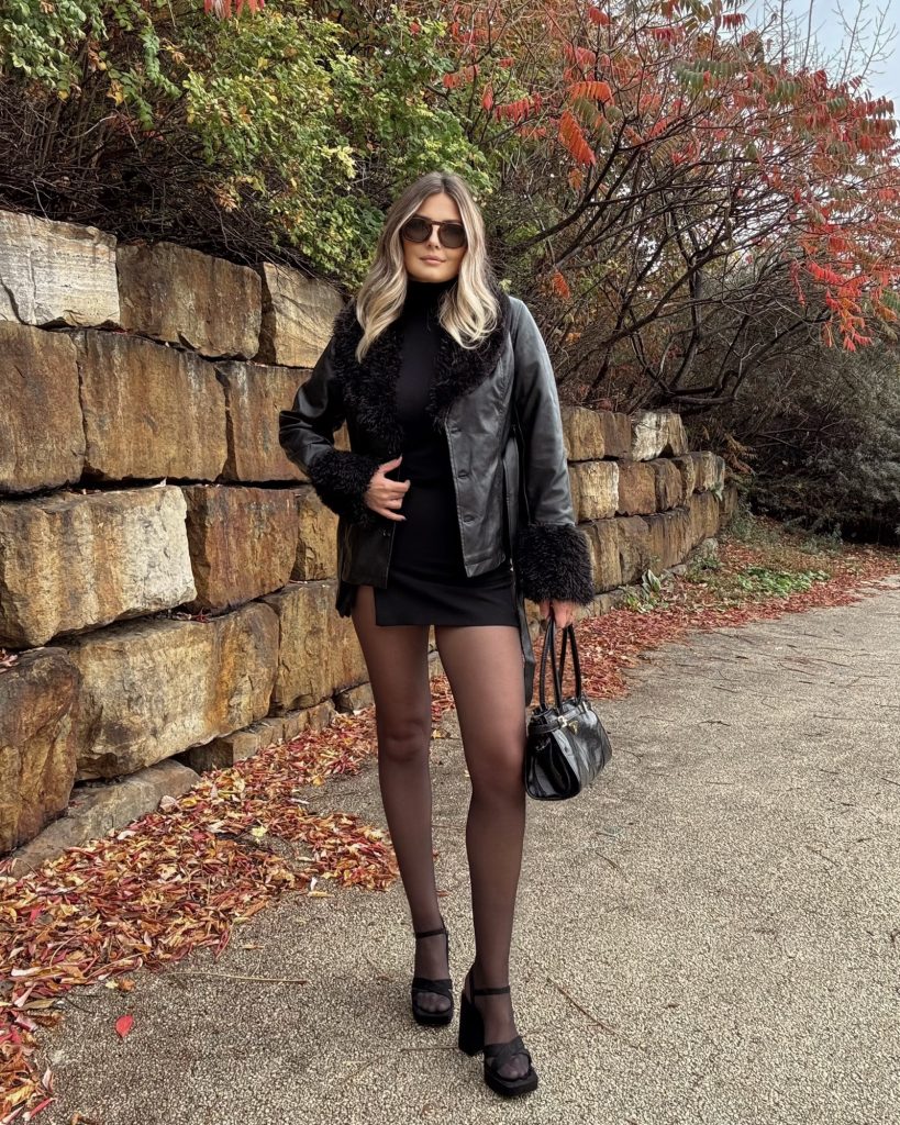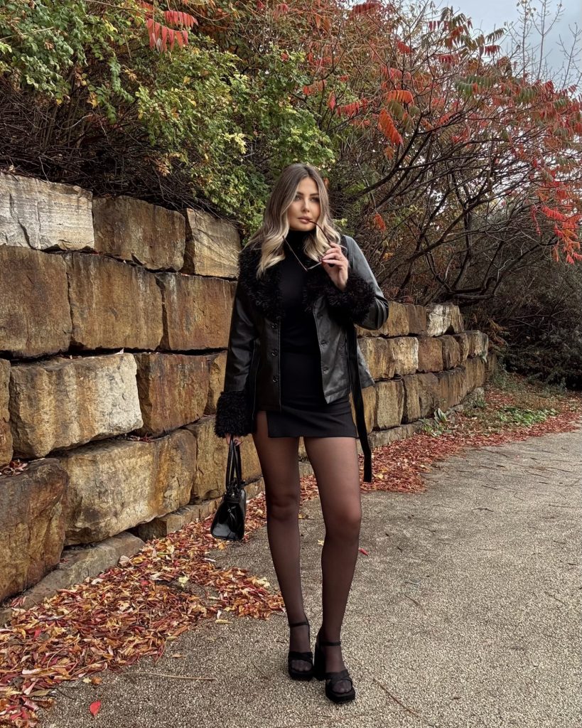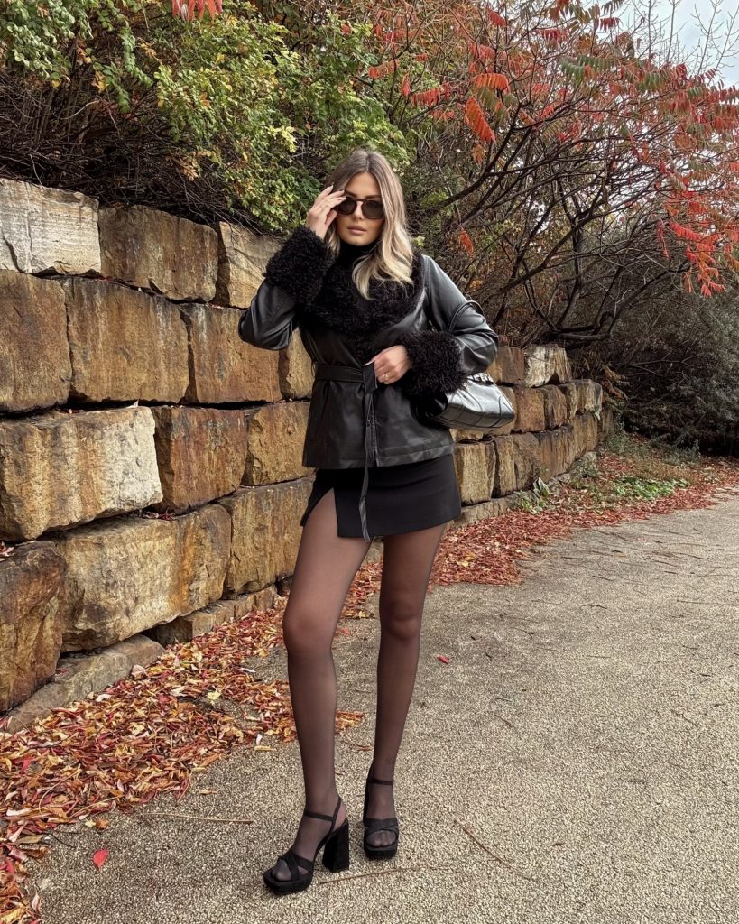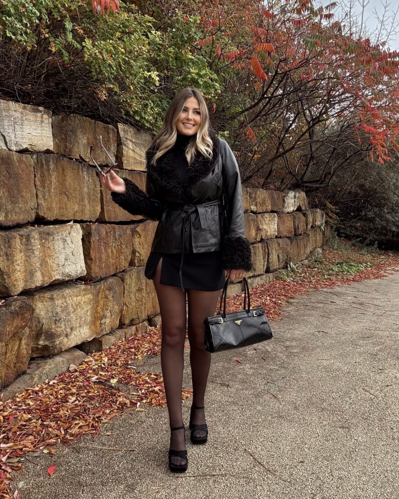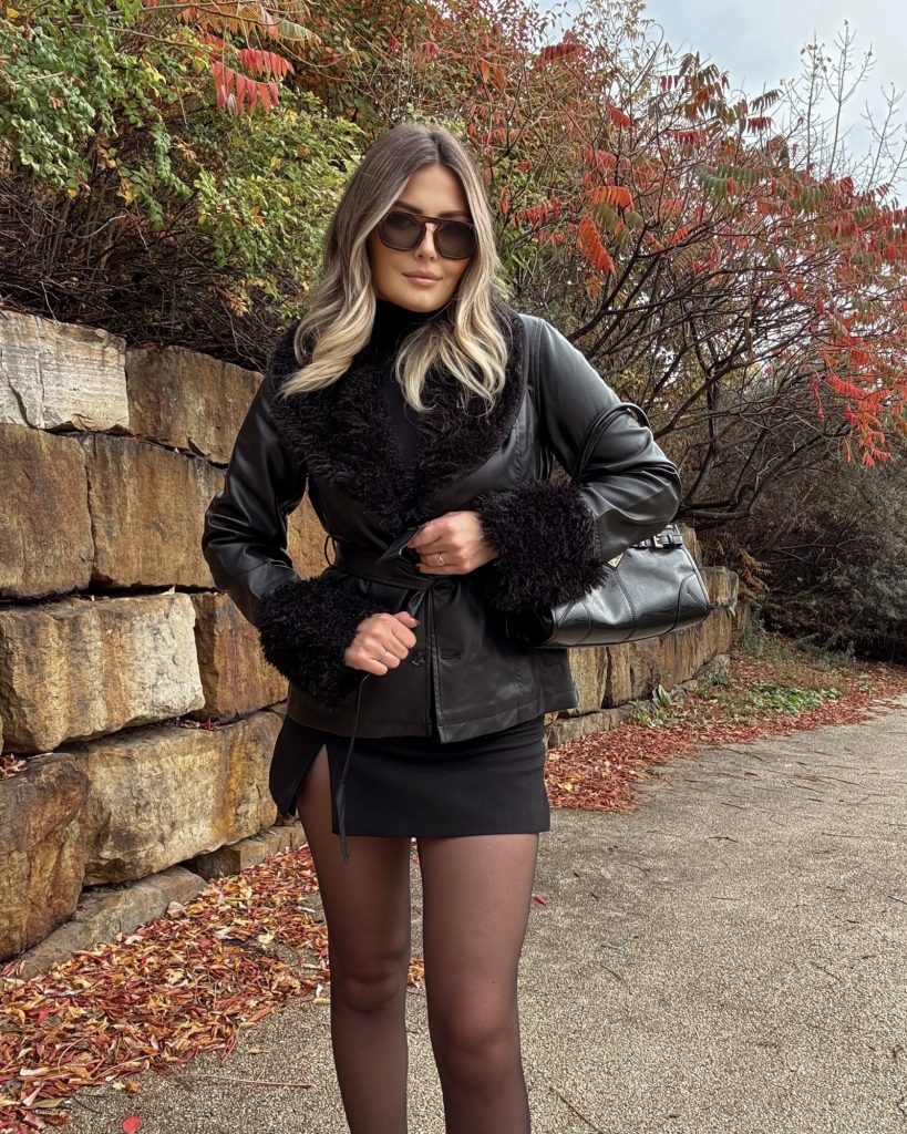 This Peppermayo jacket with Mongolian fur collar and fur-cuffs makes any look especially attractive. Styling today the jacket, with the skirt and chunky heels for the bold look.