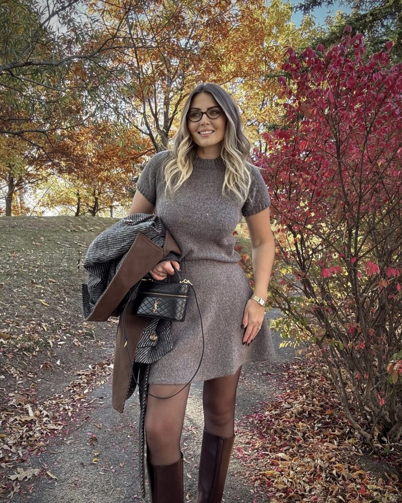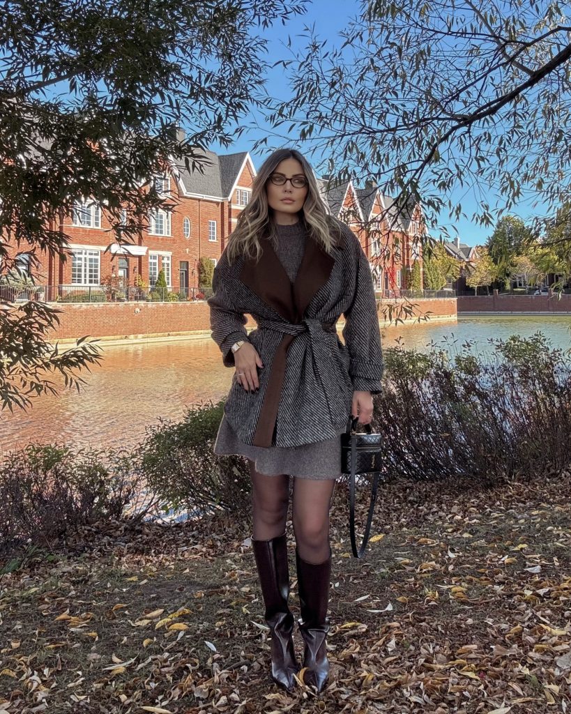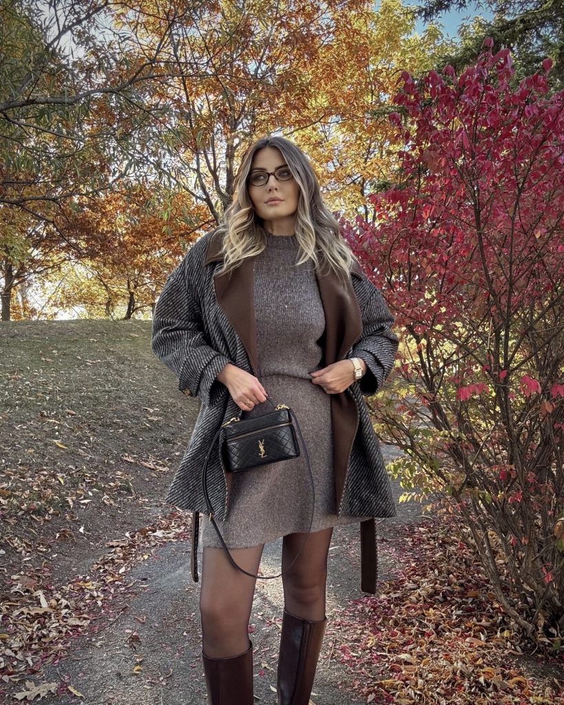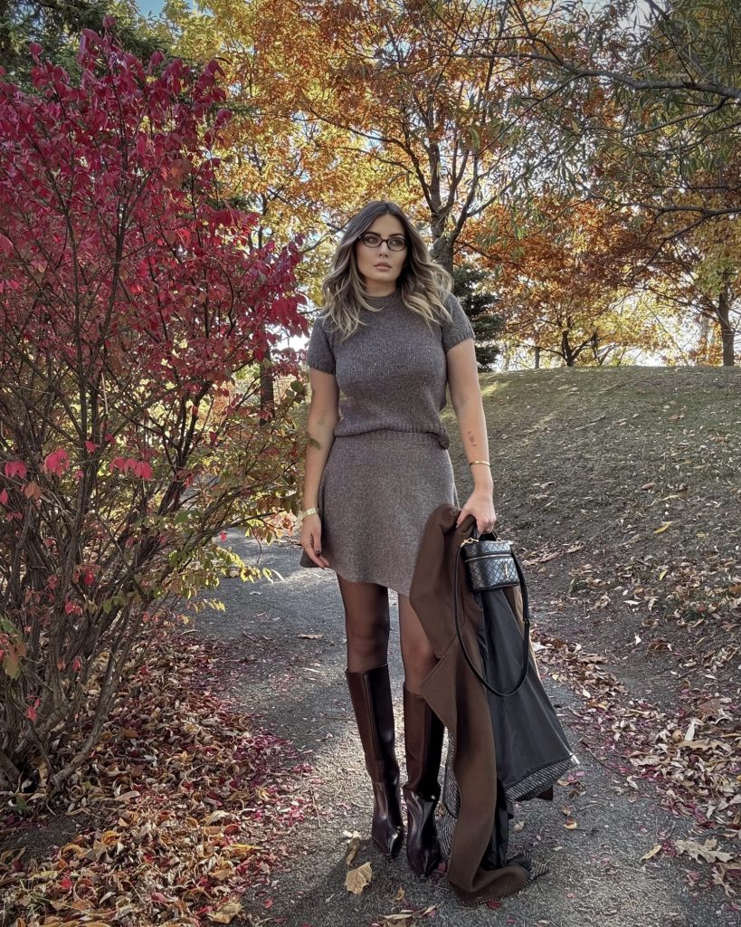 The cornerstone of fall dressing is the crewneck sweater–versatile, comfortable, and endlessly re-wearable. It is the kind of piece that keeps you warm yet serves as the perfect layering hero. And if this is the skirt set, it’s a winner. Style it with boots — some combinations never miss, and the mini skirt and knee-high boot are among them.