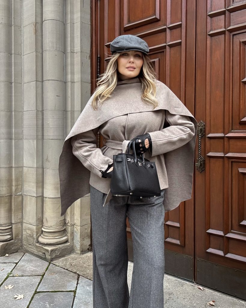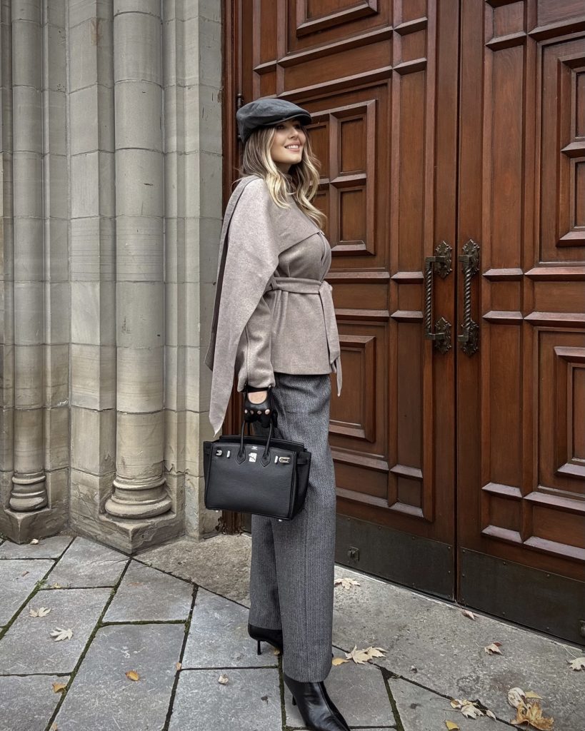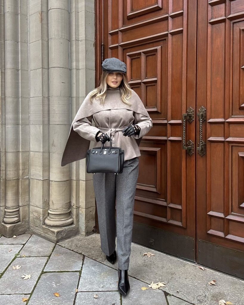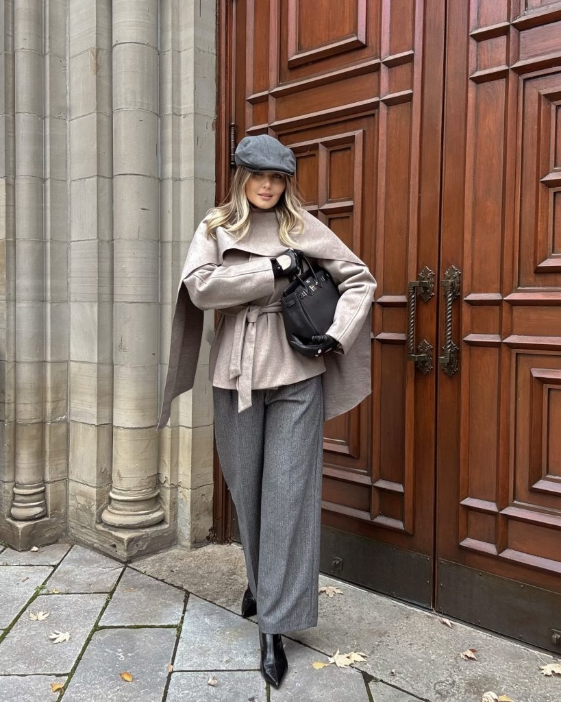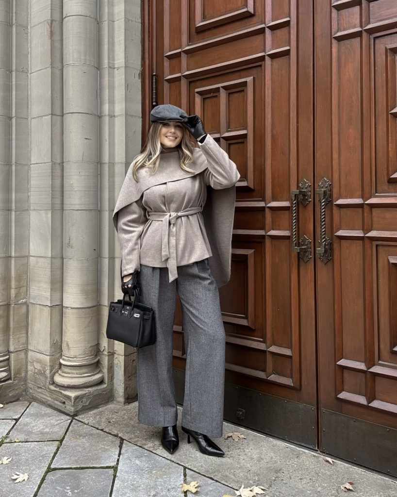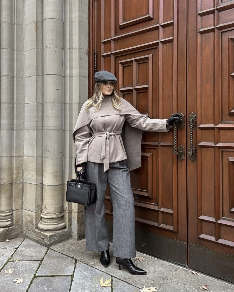 Wearing today, the scarf coat with classic wool trousers, and a hat. What a perfect ensemble for a windy day.